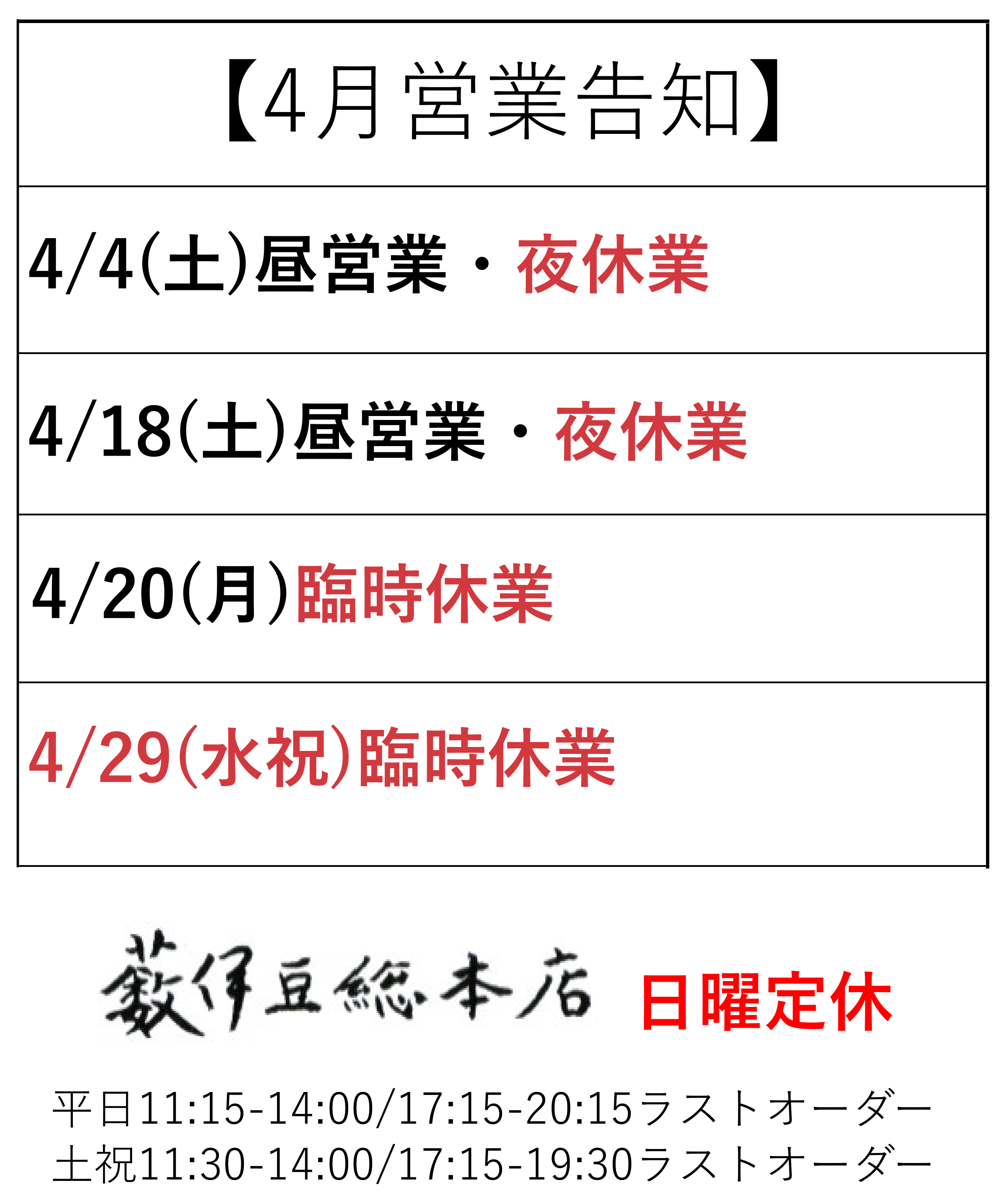 4月4日(土)・4月18日(土)昼営業・夜休業させていただきます。