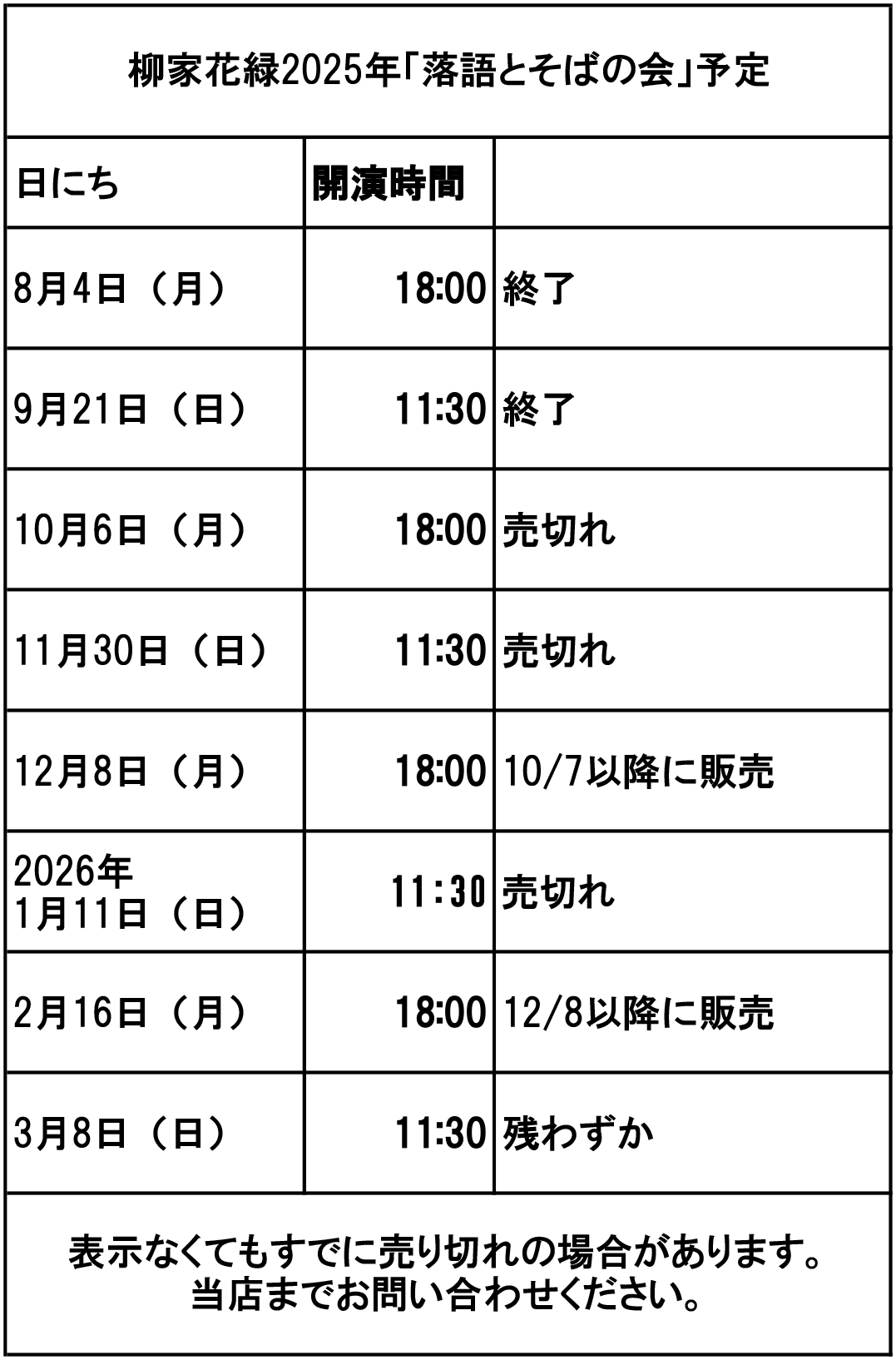 「柳家花緑の落語とそばの会」が日曜日開催の場合、店の通常の営業は休業となります。