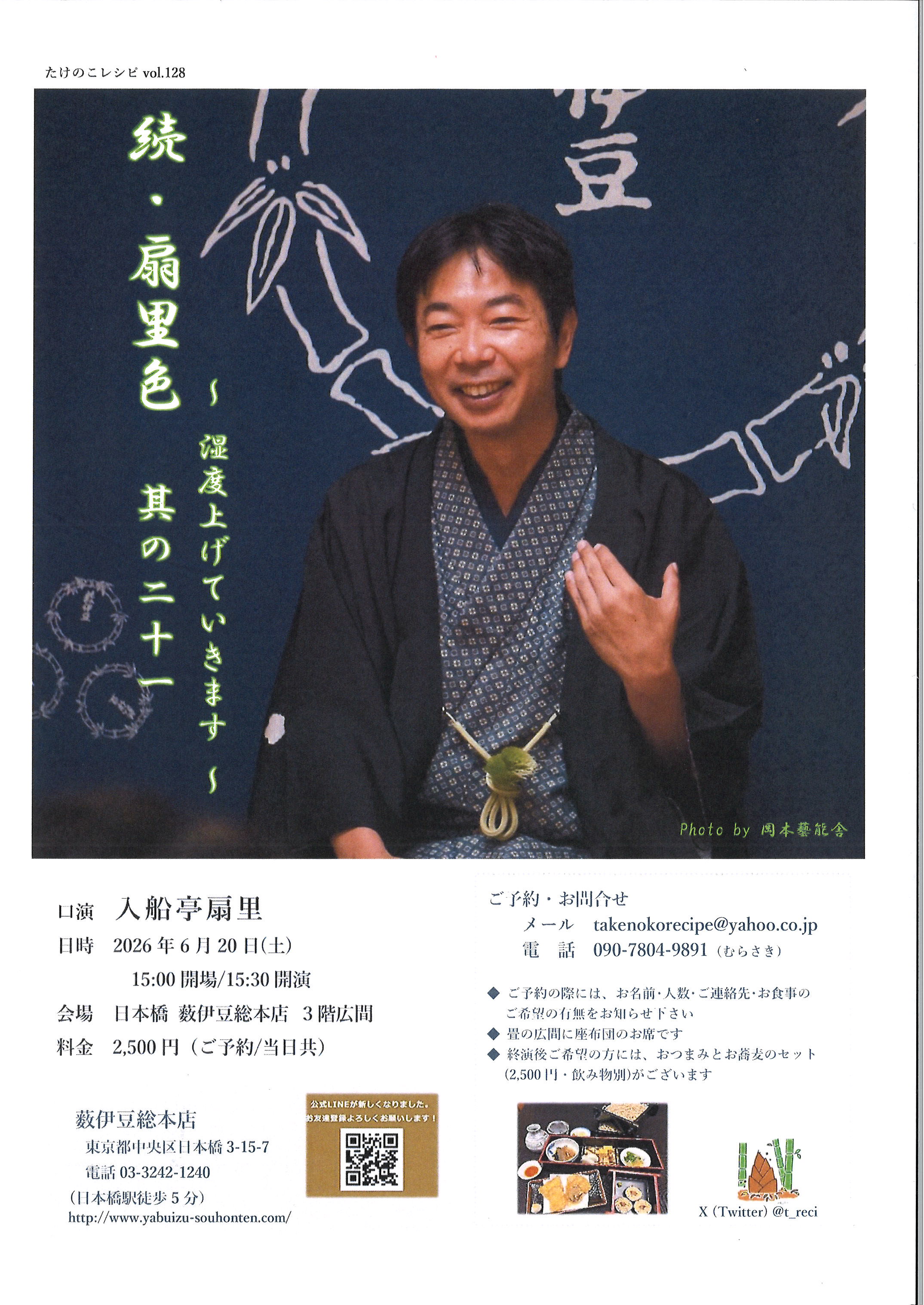 入船亭扇里「続・扇里色」開催します。 2026年2月5日寄席についてyabuizu-souhonten Tweet 6月20日(土)入船亭扇里「続・扇里色」開催します。 出演=入船亭扇里 日時=6月20日(土)午後3時半から 会場=薮伊豆総本店3階お座敷 ご予約が必要です。 ===========================================================================