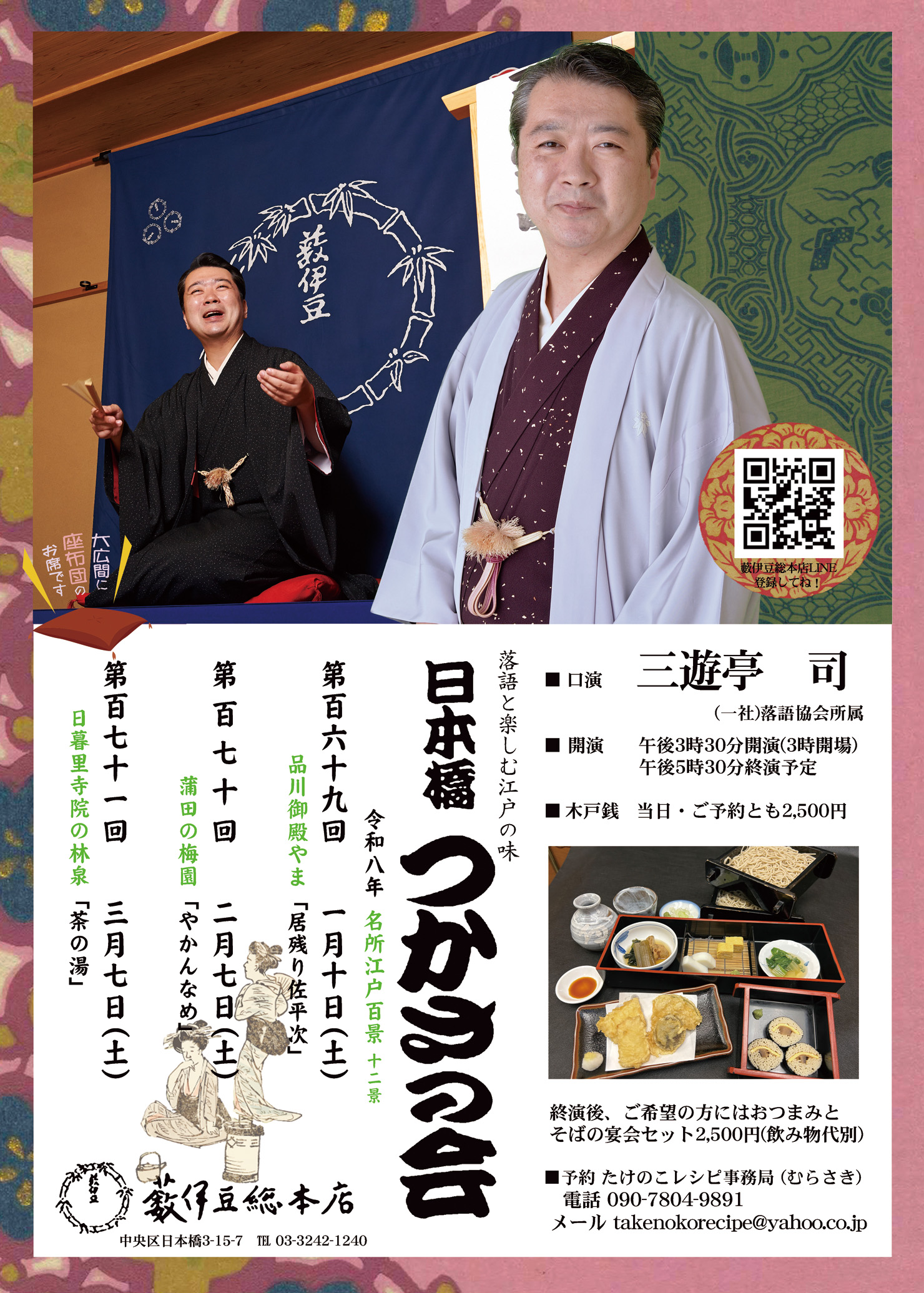 玉子焼き・板わさ・小海老と野菜の天ぷら・きんぴら・季節の野菜の煮物・せいろそば(二枚)落語をご予約の際、「おアトもよろしくセット」とお申し出下さい。