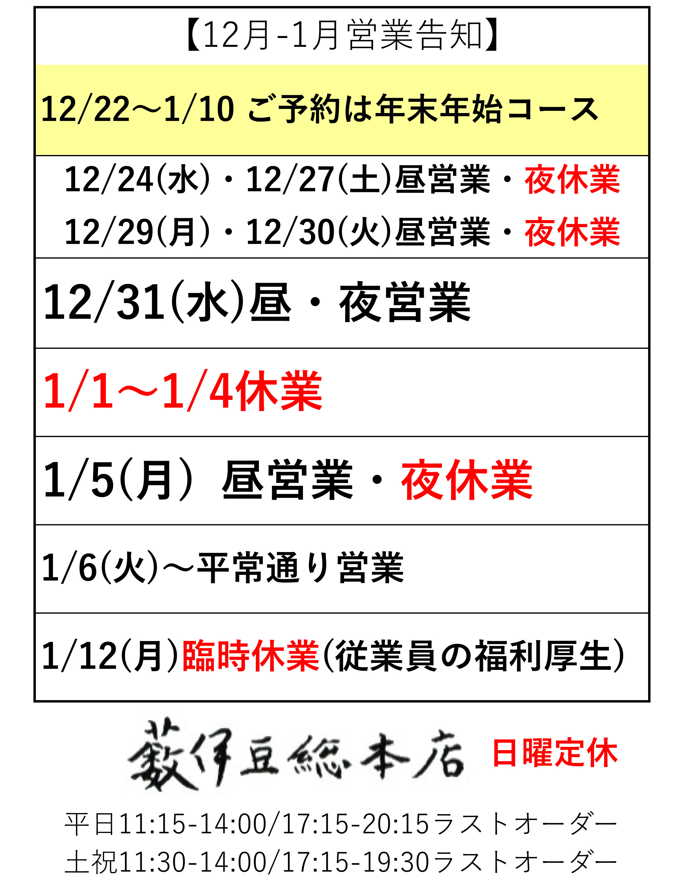 ・ご予約は昼・夜ともに年末年始コース5,000円(税込)のご予約のみとなります。
