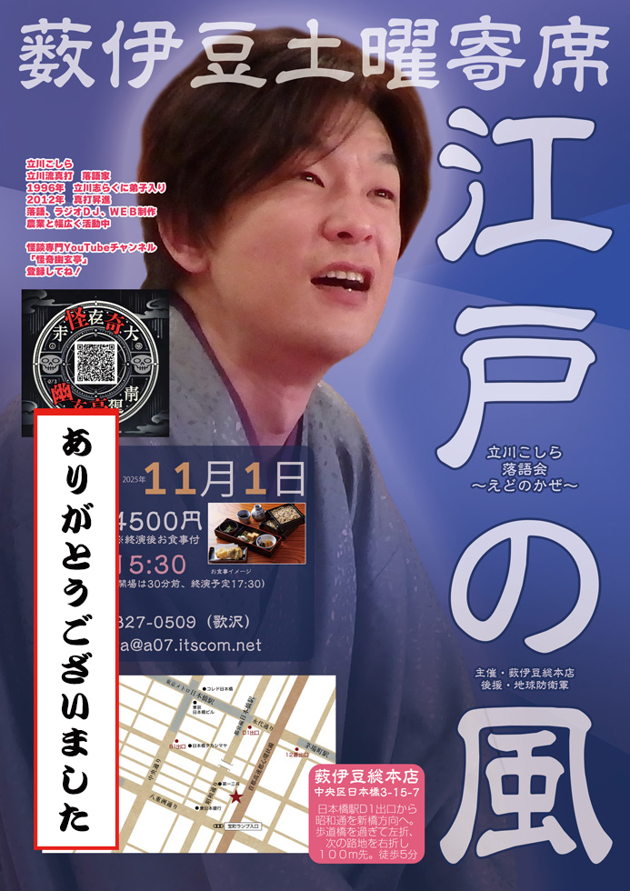 11月1日(土)薮伊豆寄席「立川こしら 江戸の風」第30回を開催します。